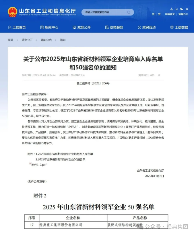 再度登榜!经典集团入选2025山东新材料领军企业50强